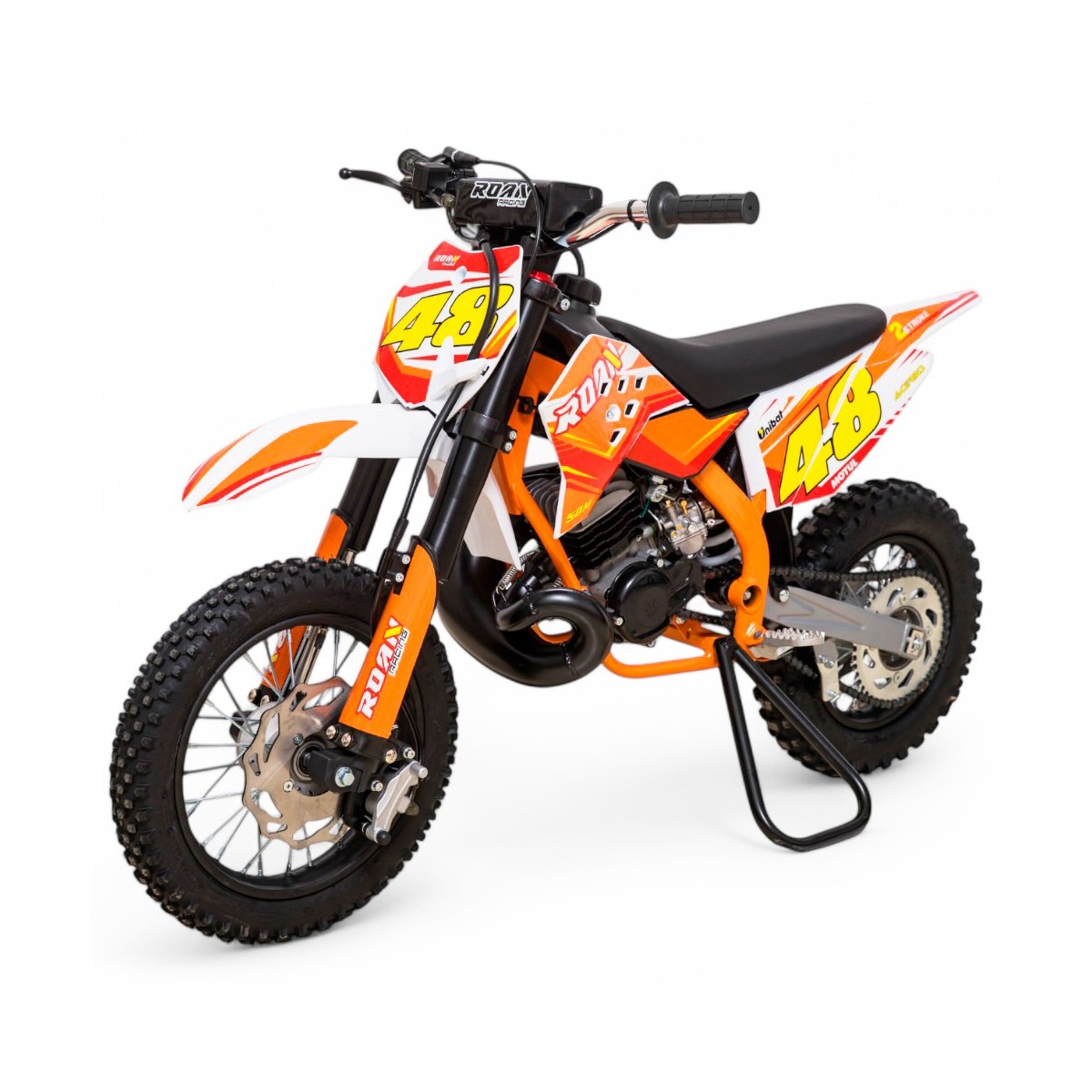 La minicross 50 cc 50M-2 es la evolución de una de las motos infantiles más populares de 50 cc, perfecta para quienes buscan una moto de motocross para niños con mayor potencia, estabilidad y un estilo llamativo. Inspirada en las réplicas de competición, combina un diseño agresivo con componentes de alta calidad, ofreciendo la mejor experiencia en circuitos cerrados y terrenos privados.