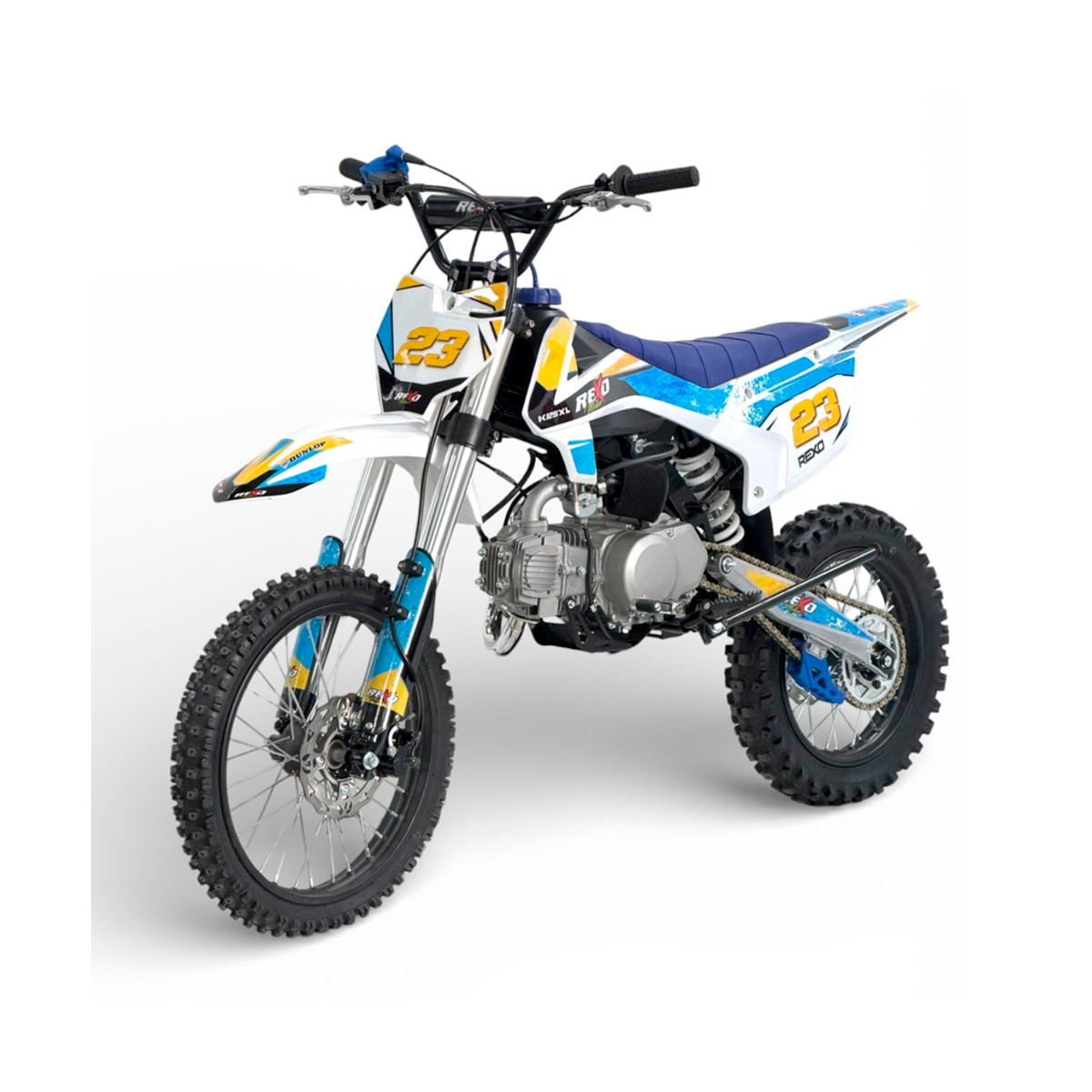 La REXO K125XL 125cc con ruedas 17/14″ es una pit bike pensada para quienes buscan una moto accesible, bien equipada y con un comportamiento más estable que los modelos de rueda pequeña. Esta versión XL destaca por su mayor tamaño, una parte ciclo más sólida y una conducción mucho más segura en terrenos de tierra.